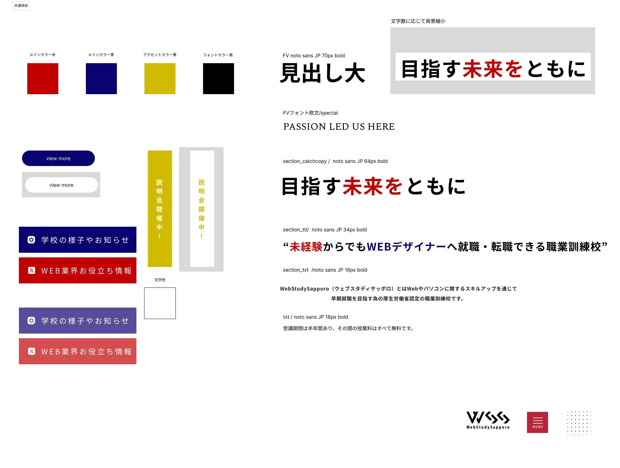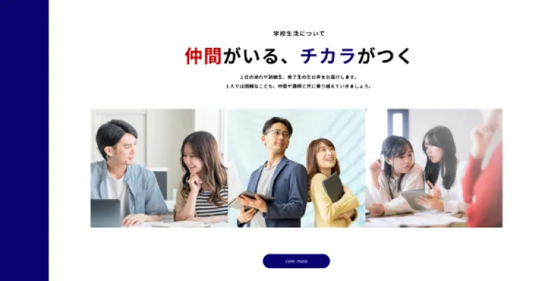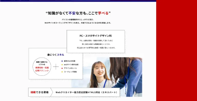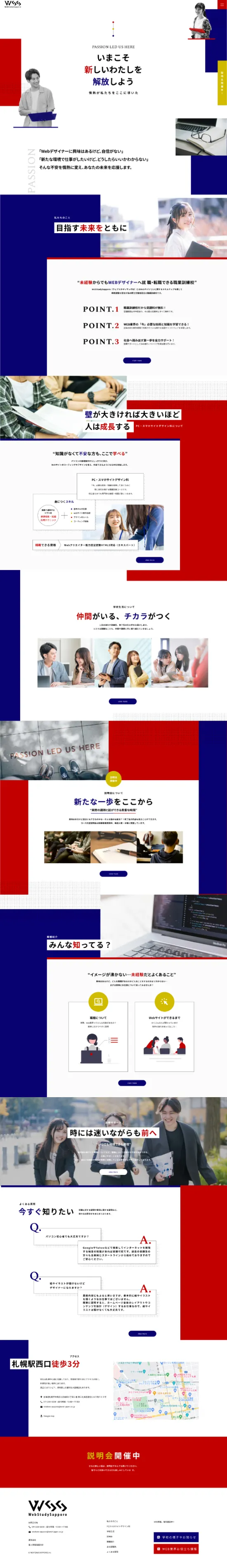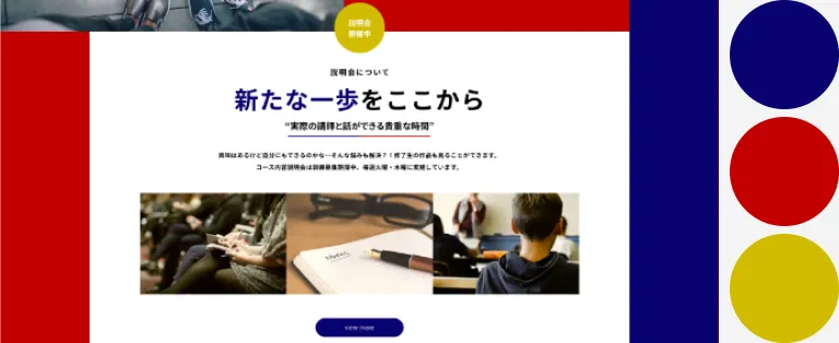 職業訓練校のため硬くはなりすぎず、でもポップにもなりすぎず、ここなら未経験でも入校してやっていけそう!と思わせれる雰囲気に作成しました。ノートを見ているかのようなデザインと特に注目してほしい説明会へのリンクなどは目立つような配色にしました。